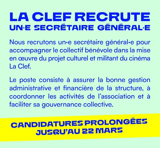 Nous recrutons un·e secrétaire général·e pour accompagner le collectif bénévole dans la mise en œuvre du projet culturel et militant du cinéma La Clef. Le poste consiste à assurer la bonne gestion administrative et financière de la structure, à coordonner…